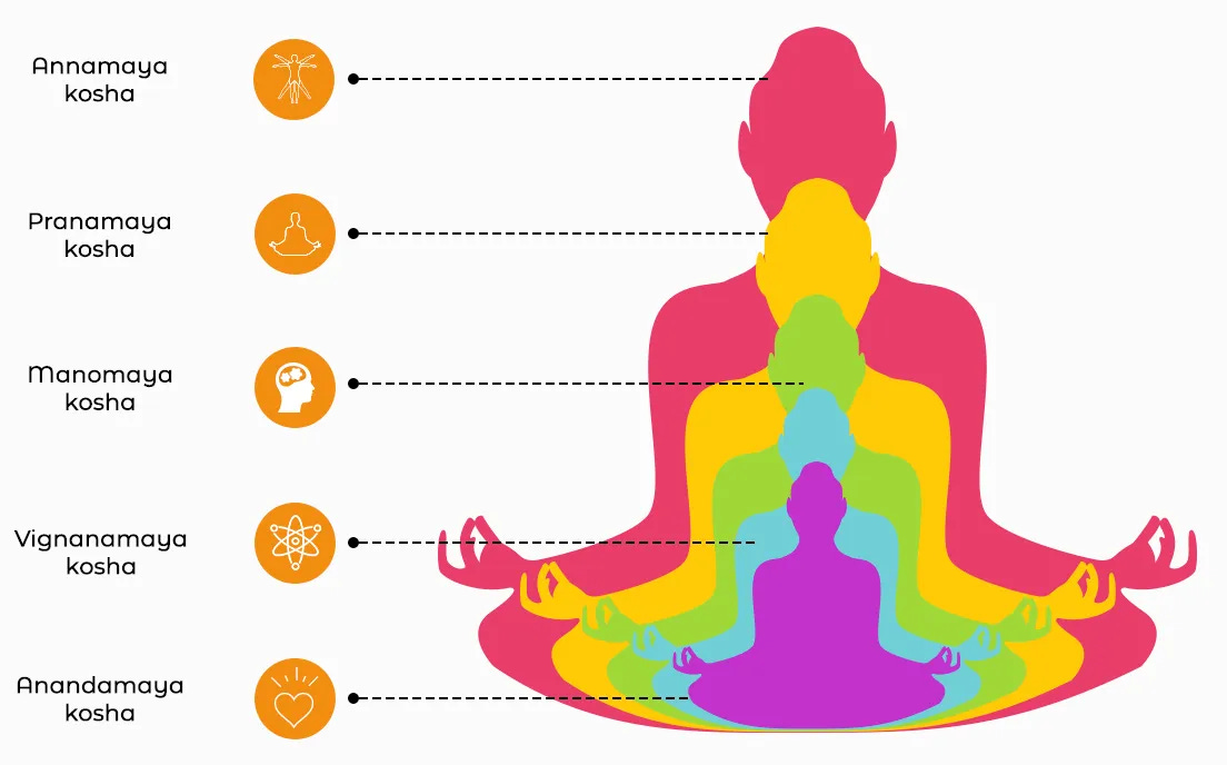 Revisiting the 5 Koshas taught in the Upanishads (on which yoga philosophy is founded), an individual is made up of 5 layers, described as “sheaths” of self — from the outermost physical to the innermost spiritual.